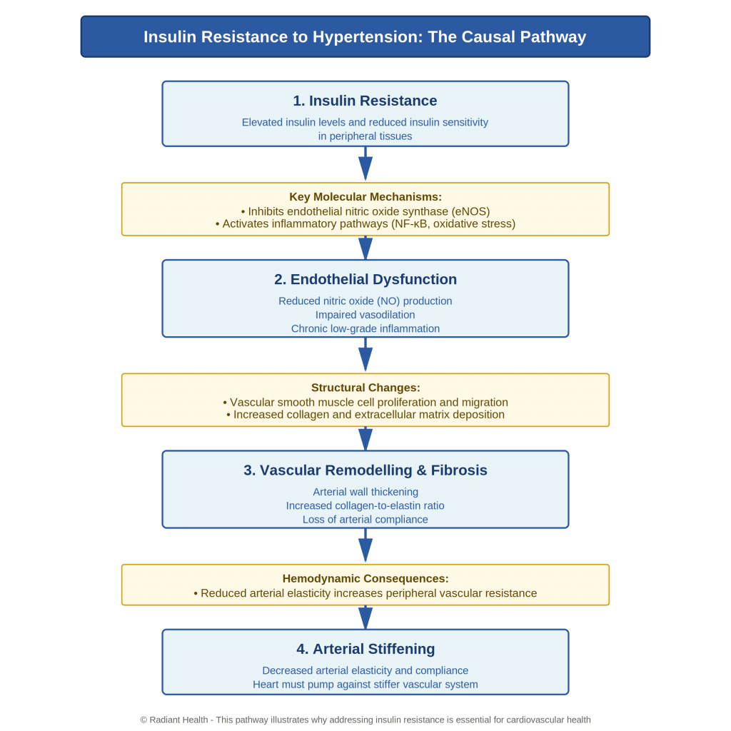 The causal pathway: Insulin resistance triggers a cascade of physiological changes that culminate in hypertension. Blood pressure medications address only the final symptom – not the root cause.