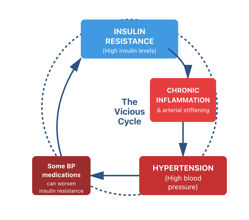 In his lecture “Treat High Blood Pressure’s Root Cause” (July 13, 2021), Dr. Jamnadas explains the connection between insulin resistance and arterial changes:“The most common reason for hypertension is metabolic syndrome—insulin resistance. High insulin causes the kidneys to retain salt, which increases blood volume. But more importantly, insulin is a growth factor. It causes the smooth muscle cells in your artery walls to grow, making the arteries stiff and narrow. This inflammation and stiffening is what leads to high blood pressure.”